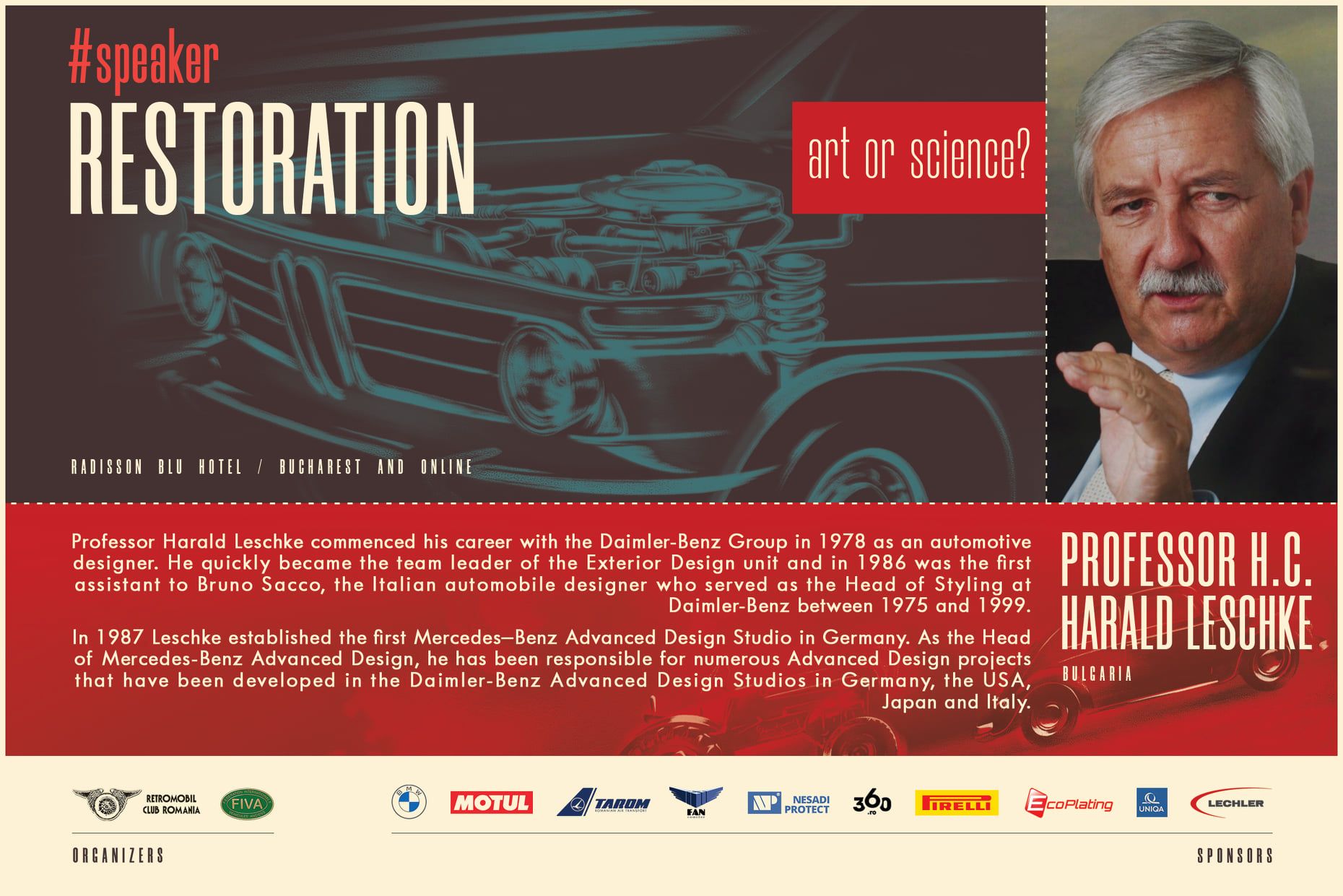 Jako první vystoupil Prof. h.c. Harald Leschke, bývalý asistent slavného šéfdesignera firmy Mercedes-Benz Bruno Sacca. Prof. Leschke byl vedoucím týmu zodpovědného za design vlajkové lodě značky Maybach. Po něm referovali ředitelé známé francouzské firmy Le Conservatoire National des Vehicules Ancienes (CNVA) Stephane Guarato a Arthur Morault, kteří se zabývali praktickými problémy spojenými s odpovědným restaurováním historických vozidel a jejich řešením v souvislosti s nedostatkem odborně vyškolených techniků, mechaniků a karosářů.