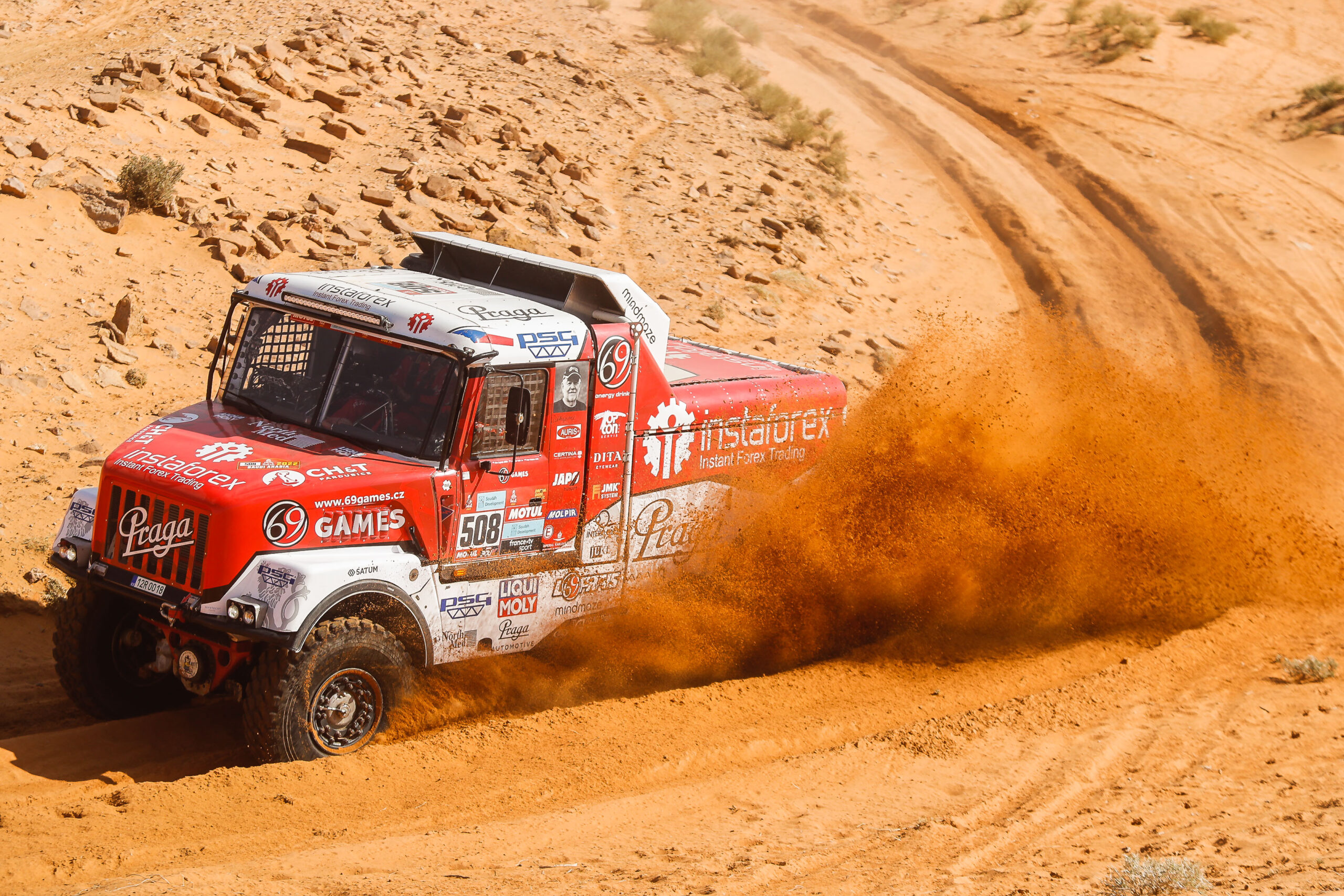 Praga #508 znovu držela vysoké tempo nasazené továrními Kamazy a patřila mezi osmičku nejrychlejších kamionů, které po čtyřech stovkách ostrých kilometrů dělilo v cíli jen o málo víc než osm minut.