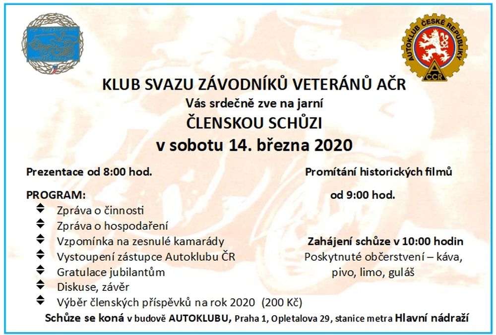 Klub závodníků veteránů AČR - pozvánka na členskou schůzi 14. 3. 2020